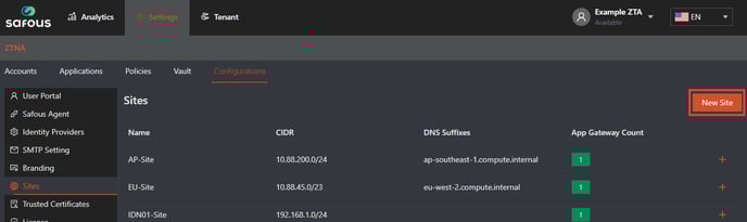 Configuration of sites can be found in the Admin Portal, under Settings > ZTNA > Configuration > Sites.