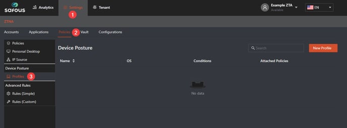 Step 1: Navigate to the Device Posture screen (Settings > ZTNA > Policies> Device Posture > Profiles).