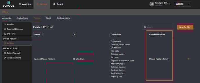 If the “Device Posture” feature is disabled in Settings > ZTNA > Configuration, the Device Posture Profile will not be enforced. It will remain connected to the policy, but will not be enforced.